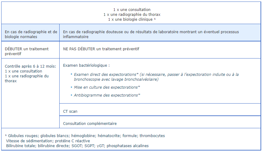 Examens remboursés par BELTA-TBnet afin d’exclure une tuberculose active avant un traitement préventif chez les personnes contact d’un malade contagieux.