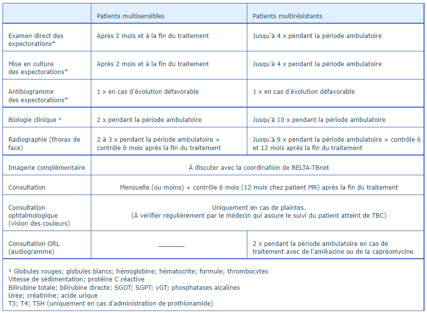 Si le patient a besoin d’examens ou de consultations plus fréquents, il faut contacter l’équipe de coordination de BELTA-TBnet afin d’obtenir l’accord pour la prise en charge.